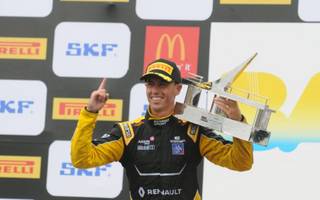 El platense Nicolás Moscardini cruza la meta, mientras que le bajan la bandera a cuadros / Fórmula 2.0