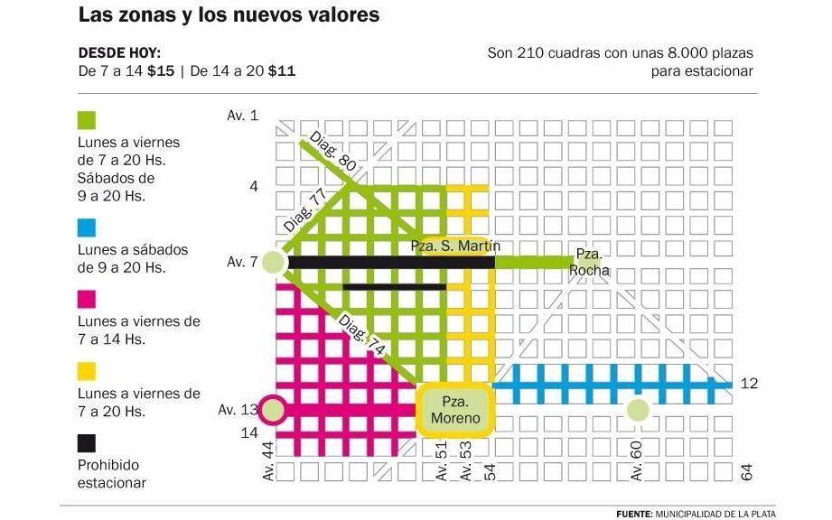 En La Plata hay 210 cuadras dentro del sistema de Estacionamiento medido -ver gráfico-, lo que representa entre 7.500 y 8.000 lugares para estacionar. El último ajuste de la tarifa se había realizado en marzo de 2016. En los últimos meses la rotación vehicular bajó notablemente.