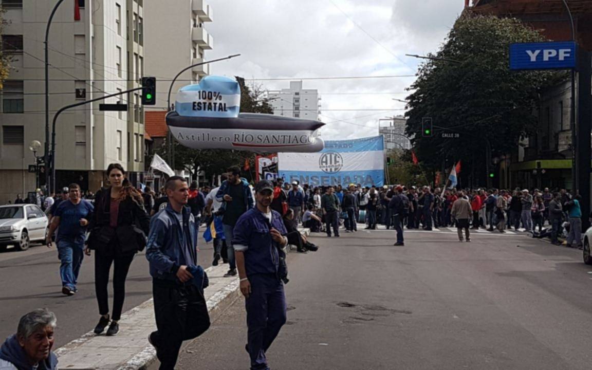 Unos 3 mil trabajadores del Astillero Río Santiago realizaron hoy una movilización a pie de 10 kilómetros que terminó al mediodía frente a la Casa de Gobierno bonaerense, en 6 entre 51 y 53, en rechazo "a cualquier tipo de intervención de la fábrica, nuevos despidos y en reclamo de más inversiones y tecnología".