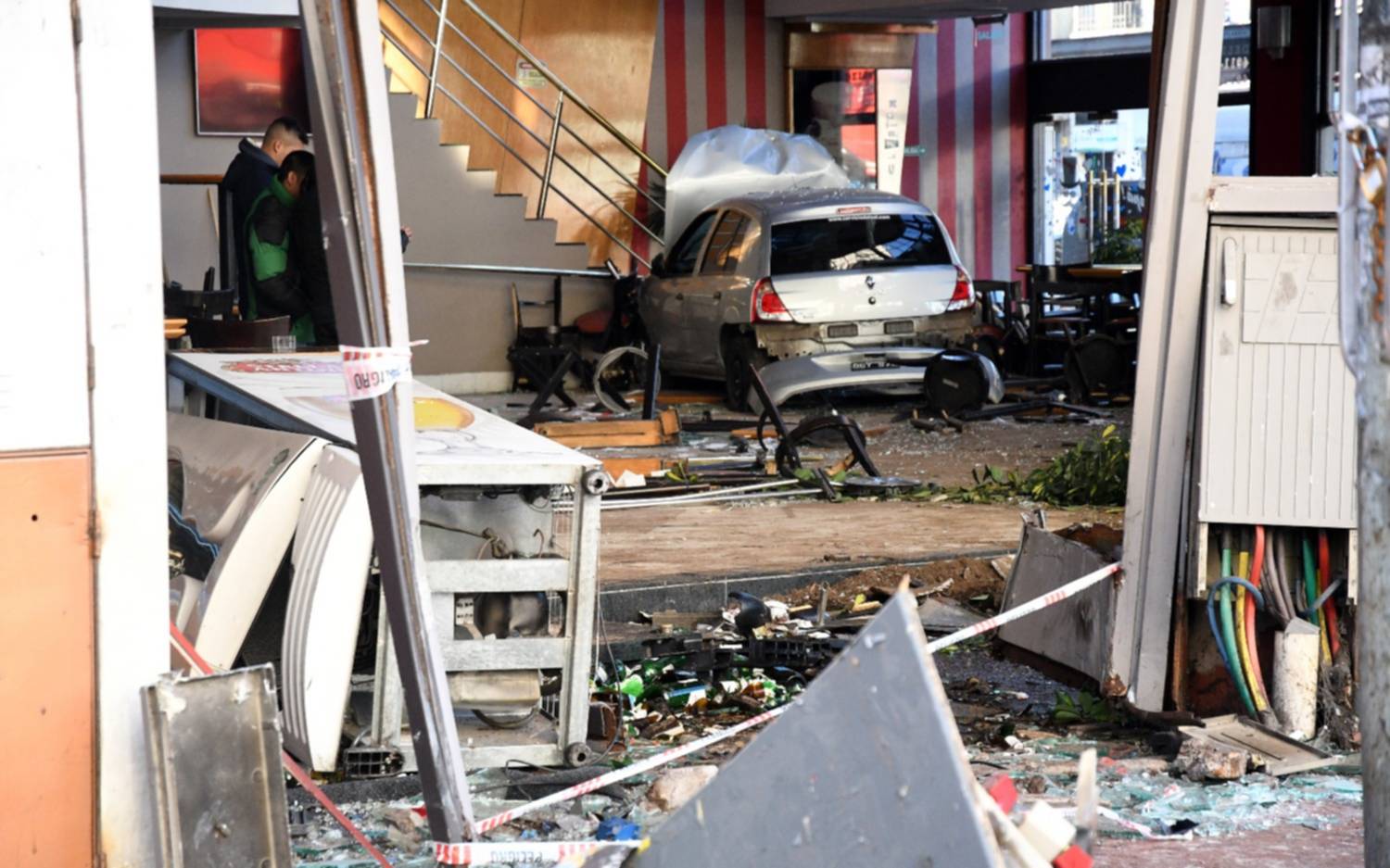 Agregaron que la zona "está además sin luz, porque en su trayecto el auto destruyó una caja de suministro eléctrico", mientras que "la destrucción dentro del local fue total, ya que se perdieron mesas, sillas, heladeras y vitrinas".
