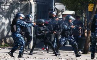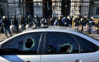 Los manifestantes reaccionaron entonces con una lluvia de piedras que hirió a varios efectivos y provocó la rotura de vidrios en la Casa de Gobierno, al tiempo que atacaron la caseta de seguridad de la plaza San Martín, mientras rompían veredas para arrojar más proyectiles contra las fuerzas de seguridad, que desplazaron el foco de conflicto hasta la avenida 7 y 50 utilizando gases lacrimógenos y disparando balas de goma.