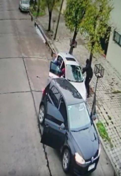 Al notar que la tardanza del compinche podía complicar demasiado sus planes, el que iba al volante del Wolkswagen decidió ir a ayudarlo. Se bajó del coche y corrió hasta el lado del conductor y golpeó varias veces el vidrio de la puerta para ver si podía arrebatar algo, pero tampoco pudo lograr su cometido.