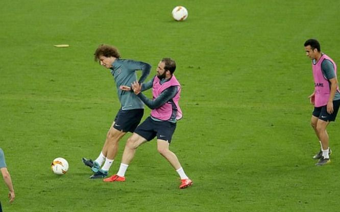 Así esta el ambiente en Chelsea a menos de 24 horas de la final, Higuain y David Luiz tienen una calurosa conversación cosa que hace que Sarri, DT del Chelsea se retire del entrenamiento algo molesto. pic.twitter.com/8dzVcZ47ZC