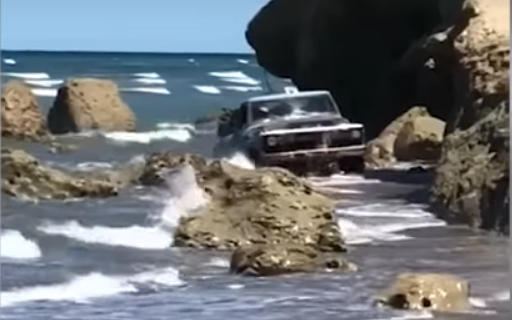Una particular escena en las playas de Las Grutas, Río Negro, se hizo viral en los últimos días: mientras asistían a una camioneta 4x4 que había quedado encajada en la arena, una vieja F-100 sin capot apareció en la rompiente de las olas que llegaban hasta el acantilado avanzando en zigzag entre las rocas y el agua.