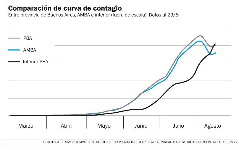 Por su parte, el ministro de Salud, Daniel Gollan, informó que en promedio, los casos en el interior representan el 12% del total de la provincia, pero advirtió que ayer ese porcentaje fue del 19%. Y en ese sentido, dijo que el tiempo de duplicación de los casos en esa región es de 18,9 días, mientras que en el AMBA es de 38 días.