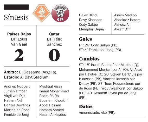 Con anotaciones de Cody Gakpo, en el primer tiempo, y Frenkie de Jong, en la etapa complementaria, Países Bajos se impuso por 2-0 al anfitrión Qatar y se aseguró un lugar en los octavos de final, como primero del Grupo A.