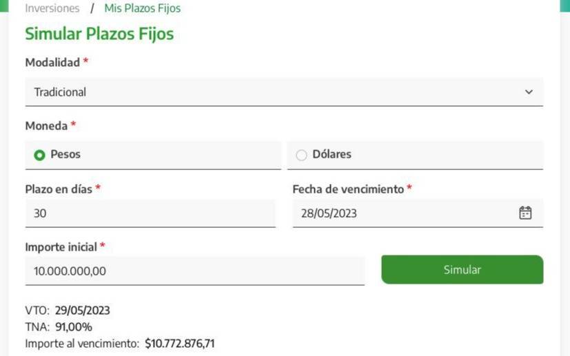 De esa manera aquellos que constituyan un plazo fijo tradicional por $50.000 a 30 días, al momento del vencimiento ganarán $3.864,38. Mientras que si optaran por hacer uno de similares características pero con una base de $100.000 al término de un mes ganarán $7.728,76, suma que supera por $ 1.000 lo que se pagaba hasta la semana pasada.