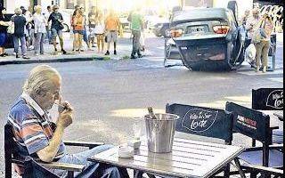Se trata de la imagen de un accidente vial, con el vehículo dado vuelta por el impacto. En contraste, un hombre aparece a metros tomando un café y encendiendo un cigarrillo.