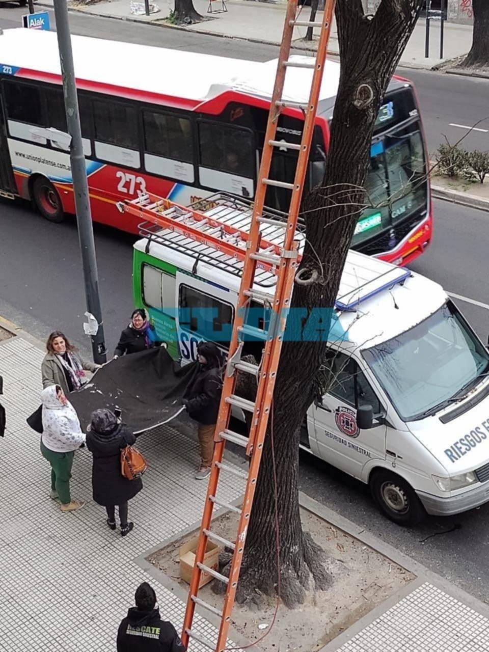Todo comenzó pasadas las 8 de la mañana, cuando una mujer advirtió que la mascota se encontraba a gran altura tras subirse a un ejemplar añoso de la vereda de 7 entre 45 y 46. Se trató de un horario con mucho movimiento ya que además de los transeúntes y aquellos que utilizan las paradas de micros para trasladarse, se daba el ingreso de trabajadores al edificio de ARBA y el ministerio de Economía.