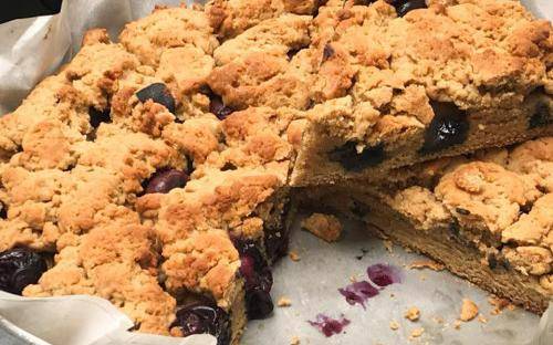 3 Poner la mitad de la preparación en un molde con papel manteca enmantecado. Agregar los arándanos e incrustarlos y agregar la otra mitad de la preparación en trozos para que te quede bien crocante.