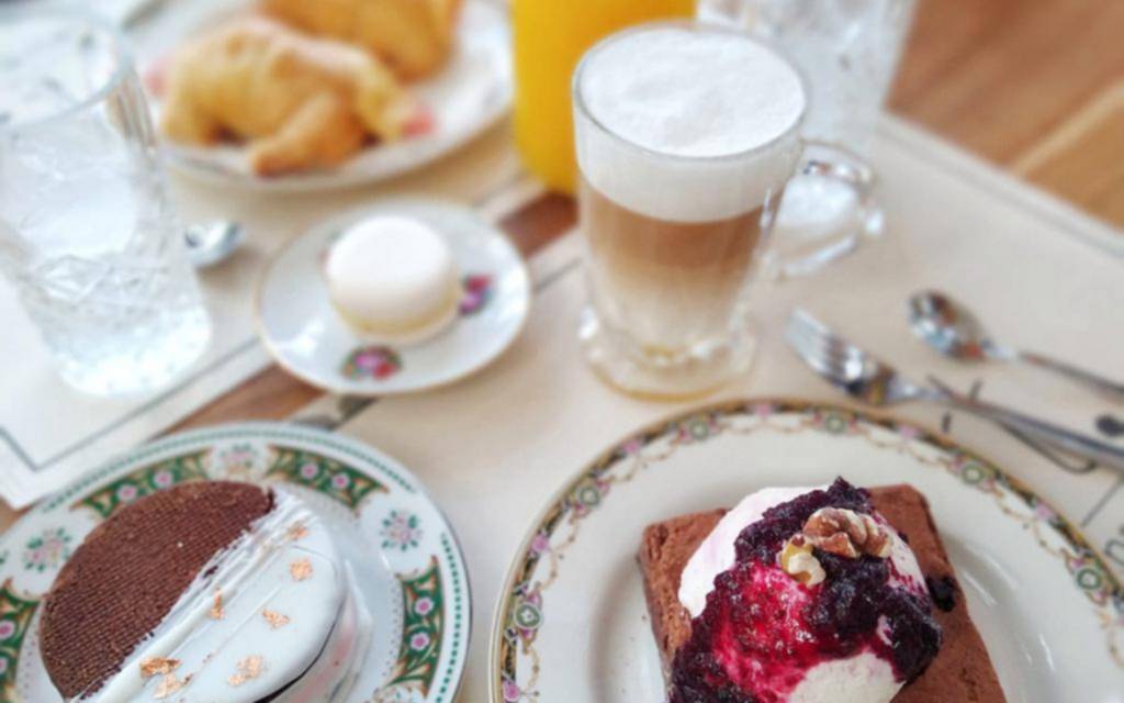 Se trata de la “Merienda San Valentín” para compartir. Tiene jugo de naranja, latte caramel, dos medialunas con jamón y queso, un macarrón, brownie con nueces y helado y un súper alfajor de chocolate y frambuesas. Todo por $14.000.