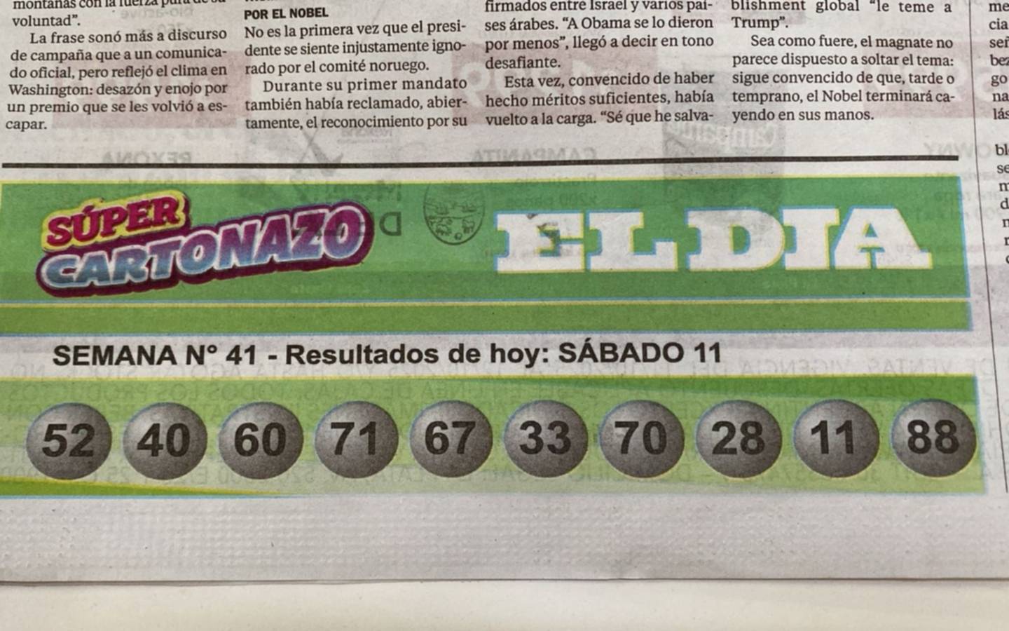 El ganador, si se presenta con el cartón con los quince aciertos y cinco cupones distintos que se publican los domingos en el diario EL DIA, además del premio semanal, podrá elegir entre un auto cero kilómetro u optar por $20.000.000.