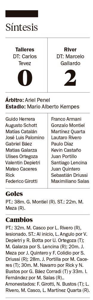 En el estadio Mario Alberto Kempes, River derrotó 2-0 a Talleres y recuperó terreno en la Zona B del campeonato, como así también se metió momentáneamente en zona directa de clasificación a la Copa Libertadores. Gonzalo Montiel y Maxi Meza hicieron los tantos del Millonario.