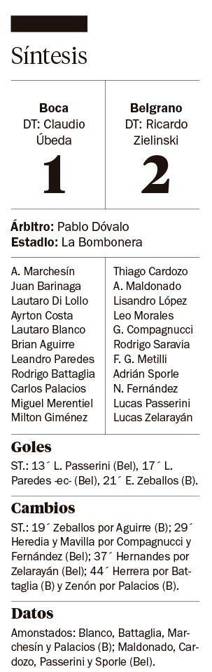 En el partido disputado en el estadio La Bombonera, el delantero Lucas Passerini, uno de los puntos altos en Belgrano, abrió el marcador a los 11 minutos del complemento, de tiro penal, mientras que el capitán Leandro Paredes, en contra de su arco, amplió la ventaja para el Pirata, a los 17.