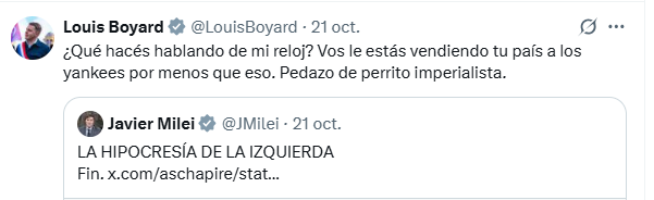 La respuesta de Boyard no se hizo esperar. En perfecto español le respondió directamente a Milei en X: “¿Qué hacés hablando de mi reloj? Vos le estás vendiendo tu país a los yankees por menos que eso. Pedazo de perrito imperialista.”