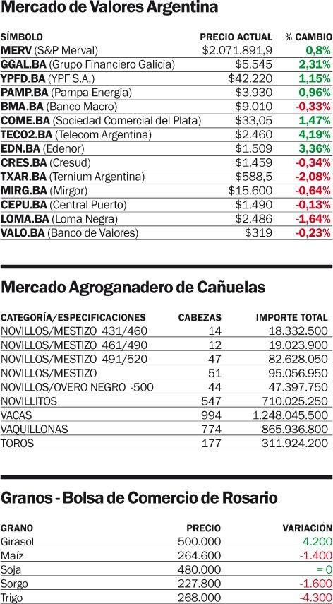 Los papeles argentinos en la bolsa de Nueva York se ubicaron en 3,5%. Los ADRs con números en verde estuvieron encabezados por Telecom (3,5%). En menor medida, los de Edenor y Grupo Fin Galicia (2,7%). Por el contrario, resaltaron pérdidas en Loma Negra (-2,6%), Irsa (-2,2%) y Grupo Supervielle (-2%). Mientras, en las empresas argentinas que cotizan directamente en Nueva York destacó la caída de Bioceres (-7,8%).