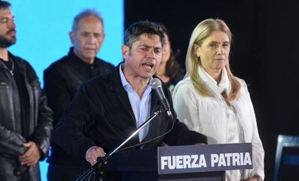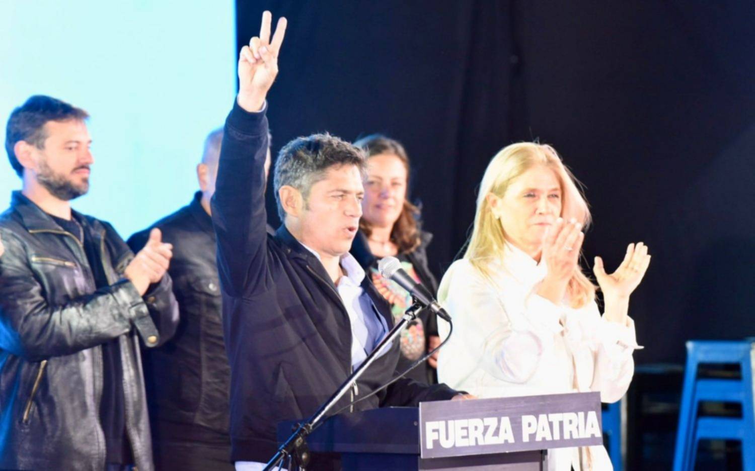 El gobernador bonaerense Axel Kicillof salió al escenario del búnker de Fuerza Patria en La Plata, secundado por los candidatos del espacio y dirigentes del kirchnerismo, entre ellos Máximo Kirchner y Sergio Massa.