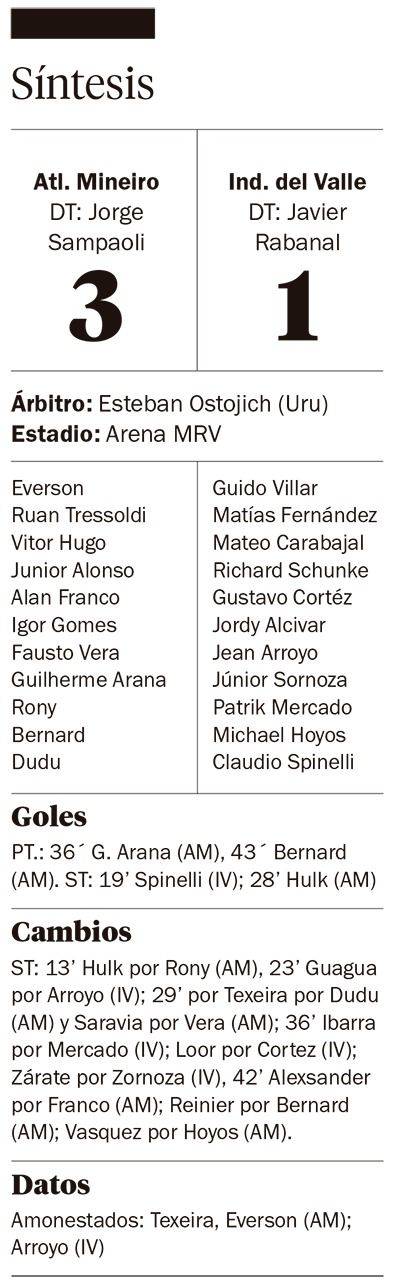 Esta vez en la Copa Sudamericana se dio la lógica: Atlético Mineiro, el quipo que dirige Jorge Sampaoli, superó como local a Independiente Del Valle 3-1 y de esta manera se metió en la final. Espera por Lanús o la U. de Chile.