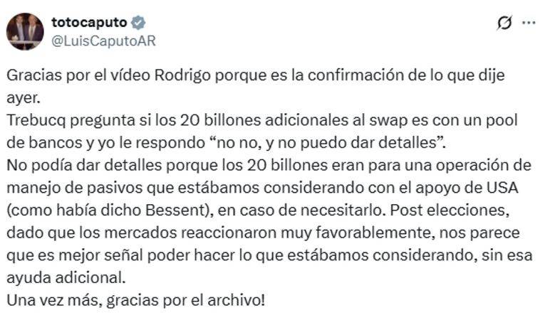 Caputo respondió a un video de una entrevista de octubre, donde él mismo había confirmado que se trabajaba en "otra facilidad por otros 20.000 millones". El Ministro explicó que ese monto estaba destinado a una "operación de manejo de pasivos" considerada con el apoyo de Estados Unidos (Scott Bessent), en caso de que fuera necesaria.
