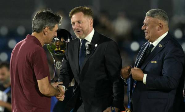 Mauricio Pellegrino, saludado por Alejandro Domínguez y Claudio Tapia