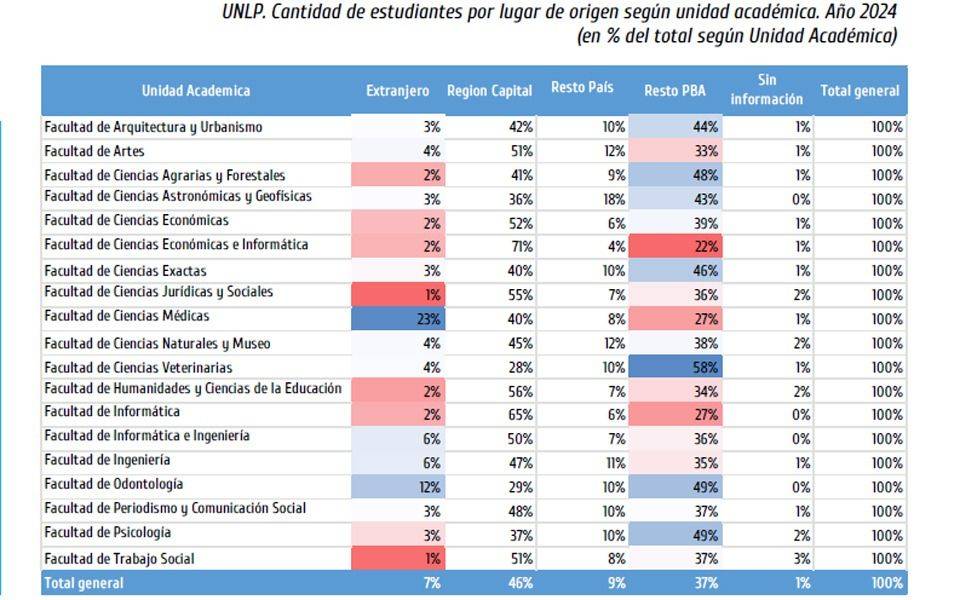 Otro 37% llega desde el resto de la provincia de Buenos Aires, mientras que el 9% proviene de otras provincias argentinas. A esto se suma un 7% de estudiantes extranjeros, número que se mantiene estable pero con crecimiento sostenido en los últimos años.