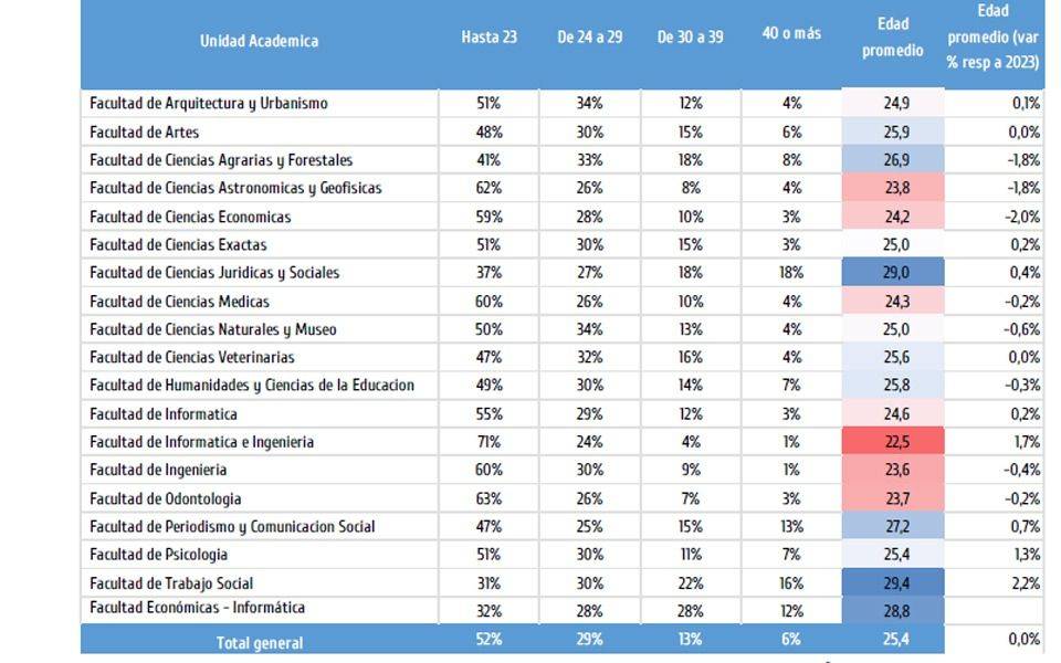 La edad promedio del alumnado se mantiene en 25,4 años. Las facultades con estudiantes de mayor edad son Ciencias Jurídicas, Trabajo Social y Económicas–Informática, mientras que Informática e Ingeniería registra la población más joven.
