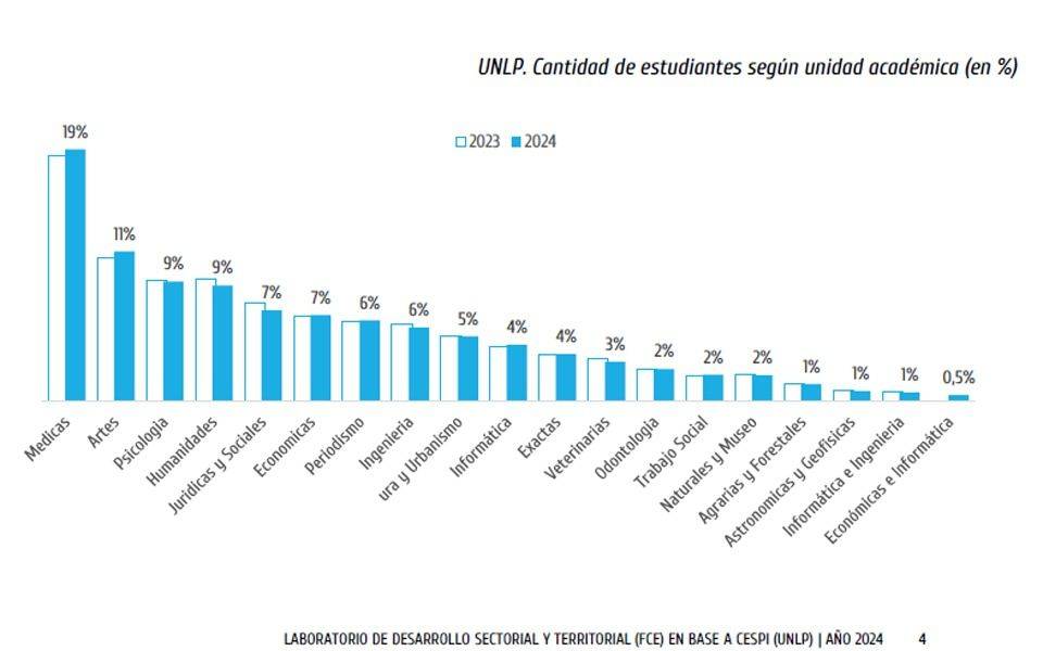 En cuanto a la distribución por unidades académicas, Ciencias Médicas concentra el 19% de la matrícula total, seguida por Artes (11%), Psicología (9%) y Humanidades (9%). En conjunto, estas cuatro facultades reúnen casi la mitad de los estudiantes de la UNLP.