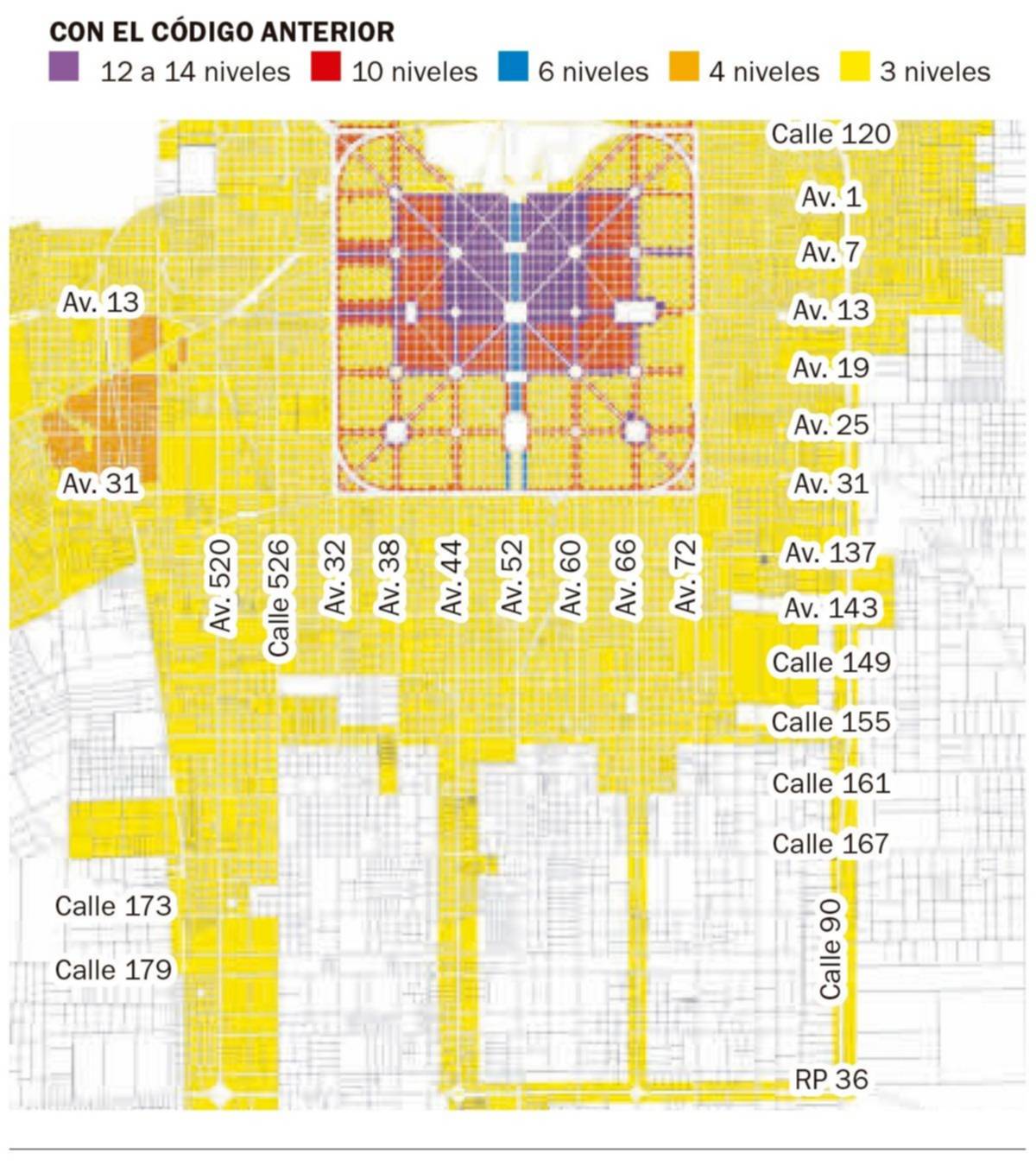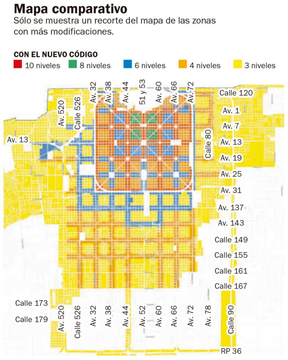 Una de las novedades es la habilitación a la elevación de las construcciones por fuera del cuadrado. Las avenidas de la zona Norte, a la altura de Tolosa, y la zona Oeste (San Carlos y Los Hornos) tendrán habilitada la posibilidad de construir hasta seis niveles en las avenidas principales cercanas al casco (la 526, la 137 y la 143) y en el área más alejada del Oeste, hasta cuatro. En algunas avenidas del sur, como la 122; la 1; la 7: la 19 y la 25, en segmentos puntuales cercanos a la Circunvalación, también se podrá elevar el nivel de los edificios hasta cuatro pisos.