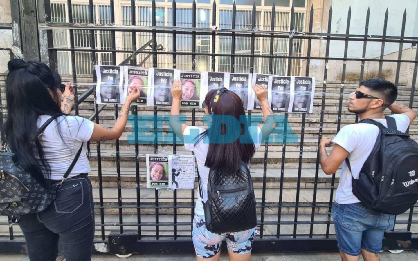 La concentración estuvo convocada para las 9 y desde esa hora comenzaron a pegar carteles en las rejas del edificio. “Todos somos Kim. Salgan a la calle desde donde estén con sus dibujos y carteles”, expresaba el flyer de la manifestación.