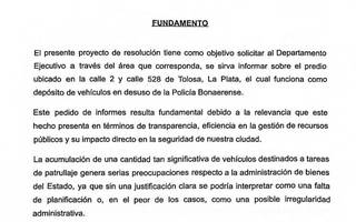 En paralelo el pasado 23 de abril, el bloque de concejales de La Libertad Avanza (LLA) elevó un pedido de informes a la Municipalidad para que la gestión de Julio Alak brinde explicaciones por el predio de 2 y 528; donde se apilan móviles de la Policía Bonaerense en desuso. En el proyecto de resolución, los concejales Guillermo Bardón, Florencia Defeo, Belén Muñoz y Florencia Barcia piden al Ejecutivo que informe la cantidad de patrulleros que se encuentran hoy en Tolosa.
