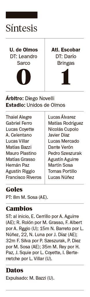 En un partido friccionado, con pocas situaciones de peligro sobre los arcos, Unidos de Olmos perdió ayer por 1-0 ante Atlético Escobar, en el partido de ida de las semifinales del Federal Amateur, Región Pampeana Norte.