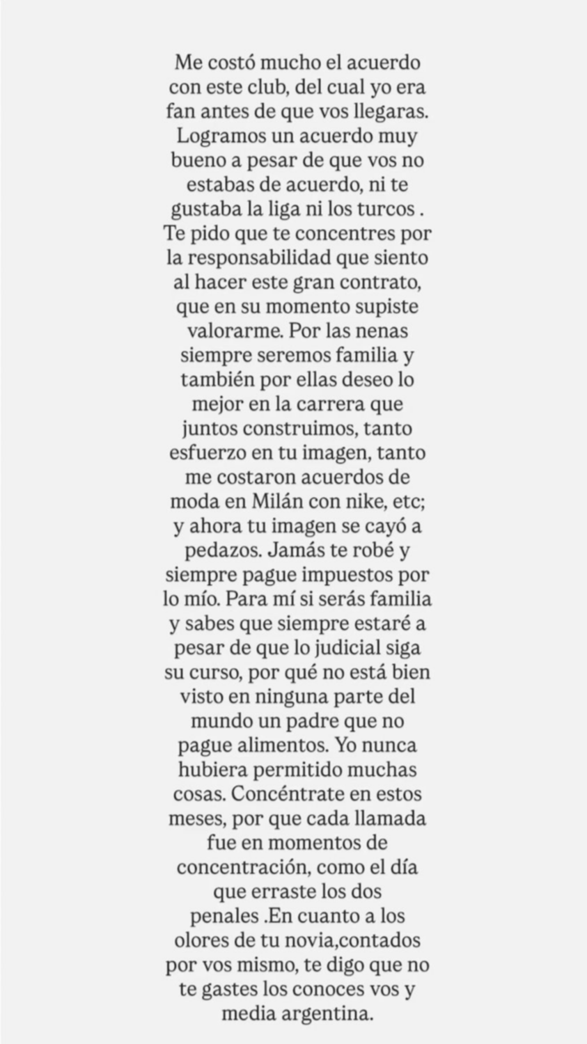 La cronología del escándalo sigue con Wanda Nara saliendo fuerte y al medio con un comunicado que lo dejó muy expuesto. En primer término, la hermana de Zaira contó que le costó “mucho el acuerdo” con el Galatasaray y marcas internacionales, por lo que le pidió “que te concentres por la responsabilidad que siento al hacer este gran contrato”.