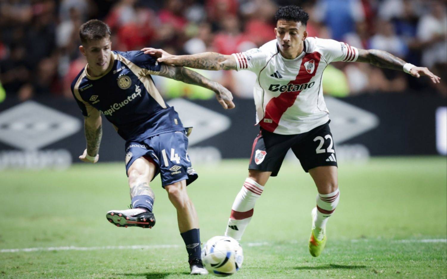 El partido comenzó con intensidad y la primera situación clara fue para River a los 7 minutos. Gonzalo Montiel quedó mano a mano con Brayan Cortés tras una acción profunda, pero su remate salió desviado junto a un palo. En esa jugada, el defensor reclamó infracción de Emiliano Viveros dentro del área, aunque el árbitro no sancionó penal. A los 12 minutos, Marcos Acuña recibió tarjeta amarilla por una falta sobre Leandro Lozano, y se convirtió en el segundo amonestado del conjunto dirigido por Marcelo Gallardo, junto a Montiel.