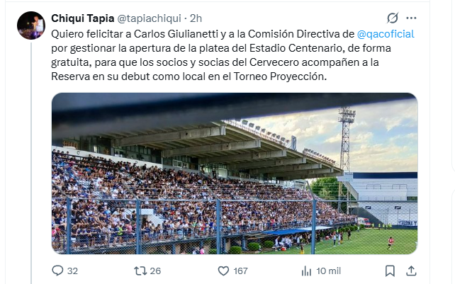 "Quiero felicitar a Carlos Giulianetti y a la Comisión Directiva de @qacoficial por gestionar la apertura de la platea del Estadio Centenario, de forma gratuita, para que los socios y socias del Cervecero acompañen a la Reserva en su debut como local en el Torneo Proyección", expresó Tapia. Además, el titular de la AFA resaltó la respuesta de los hinchas cerveceros y el impacto de la iniciativa en la vida institucional del club. "Una acción para aplaudir, que permitió que más de 2000 personas se acerquen a alentar a los juveniles en su partido frente a Estudiantes de La Plata, dándole valor y prestigio a la institución", agregó.