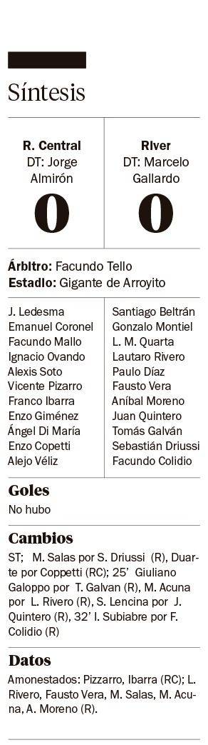 La salida de Quintero dejó a River sin la pausa ni el manejo de la pelota. Por eso el equipo se volvió más directo y con muchos pelotazos. Terminó mejor Central , con Di María más metido y peligroso mostrando lo que no había hecho antes. Pero se defendió bien el Millonario, que con Paulo Díaz recuperó solidez.