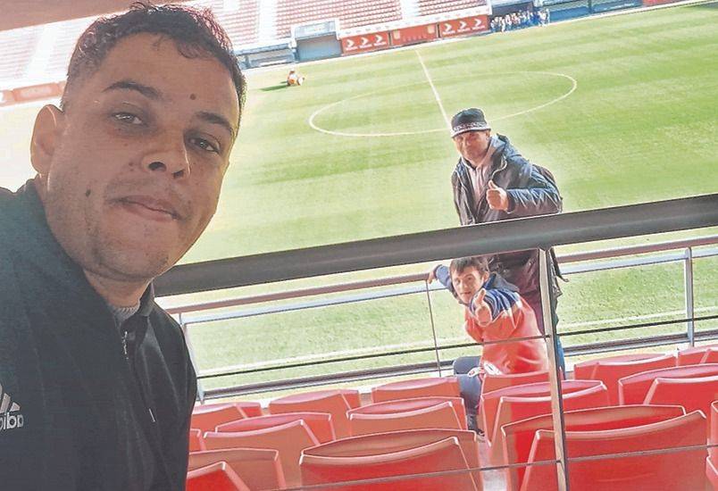 Damián Alcaráz junto a un paciente en la cancha de Estudiantes - EL DIA