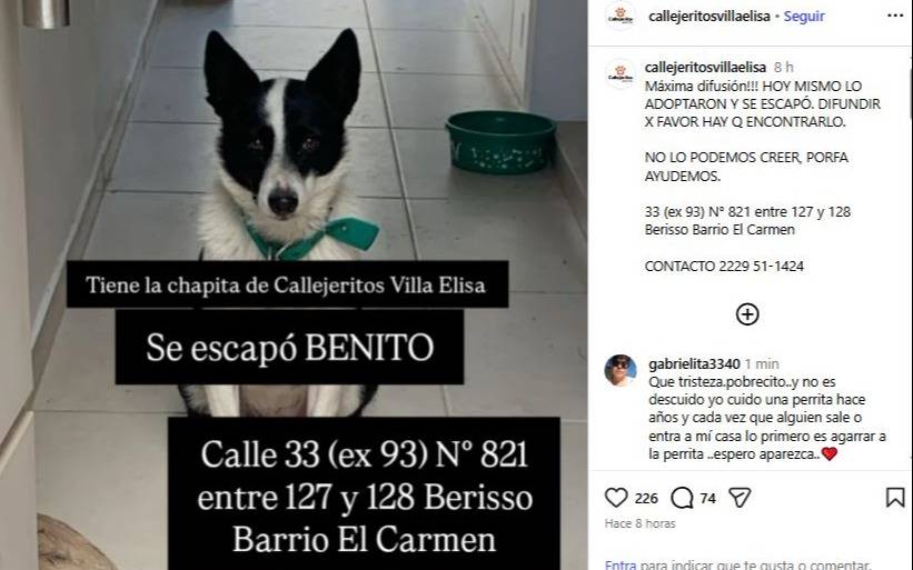 Su nueva familia reportó anoche, en el mismo día que lo adoptaron, que Benito se fue de su nueva morada situada en 33 Nº821 entre 127 y 128 del barrio El Carmen. En ese sentido pidieron máxima difusión en medio de la tristeza. "No lo podemos creer, hay que encontrarlo", versa el mensaje dirigido a los vecinos de la zona.