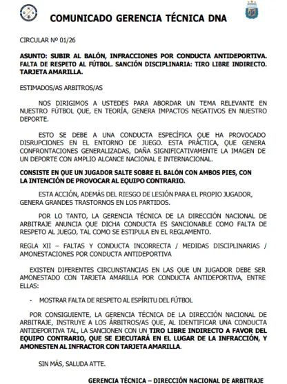 Siguiendo el modelo brasileño, Beligoy bajó línea a todos los árbitros del país bajo el asunto: “Subir al Balón, infracciones por conducta antideportiva y falta de respeto al fútbol”. El comunicado oficial sostiene que esta práctica genera impactos negativos y daña la imagen del deporte, provocando confrontaciones que exceden lo estrictamente futbolístico. A partir de ahora, cualquier jugador que salte sobre el balón con ambos pies con intención de burla será castigado con severidad, buscando evitar que las provocaciones individuales escalen a grescas colectivas.