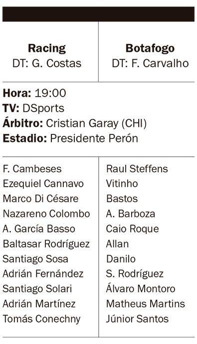 En tantgo que Racing recibirá a Botafogo por el Grupo E de la Copa Sudamericana. El encuentro, que iniciará a las 19, se llevará a cabo en el Estadio Presidente Perón y se podrá ver a través de DSports. El árbitro será el chileno Cristian Garay.