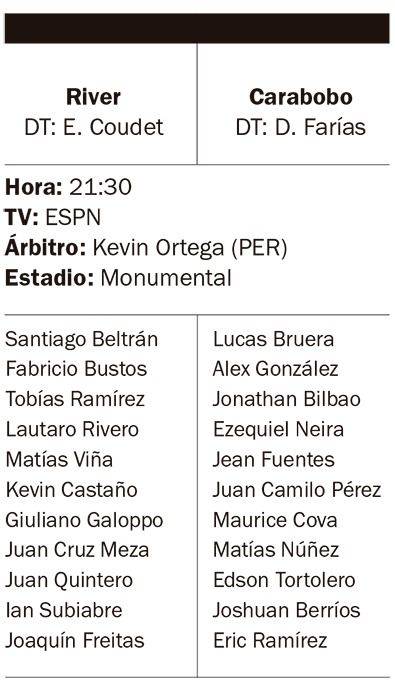 River recibirá esta noche a Carabobo, por la segunda fecha del Grupo H de la Copa Sudamericana, con el objetivo de reponerse luego del flojo debut que tuvo la semana pasada. El partido, que está programado para las 21:30, se llevará a cabo en el Estadio Monumental, se podrá ver a través de ESPN y Disney+.