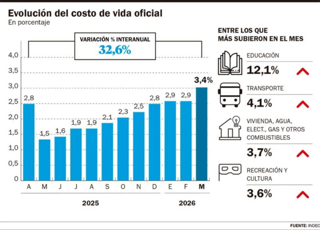 La división con mayor aumento fue Educación, con 12,1%. Si bien la suba suele darse por el fenómeno de estacionalidad, el alza que marcó el rubro fue mucho mayor que la media. Le siguió Transporte, con el 4,1%, debido a los combustibles, el transporte público y los pasajes aéreos. Desde el inicio del conflicto en Medio Oriente, el precio de los combustibles incrementó su valor en un 23%.