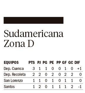 San Lorenzo recibirá hoy desde las 21:30 a Deportivo Cuenca de Ecuador, por la segunda fecha del Grupo D de la Copa Sudamericana. Televisa DSports. Al Ciclón se le presenta una muy buena oportunidad luego del empate del martes entre Santos y Recoleta.