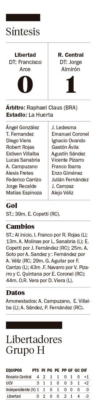 Cuando se iba el partido en el estadio La Huerta, una vez más en cerrado empate en cero, apareció Enzo Copetti (saltó desde el banco) marcó el único gol con el que Rosario Central venció anoche por 1-0 a Libertad, en un partido cerrado que forma parte del Grupo H de la Copa Libertadores.