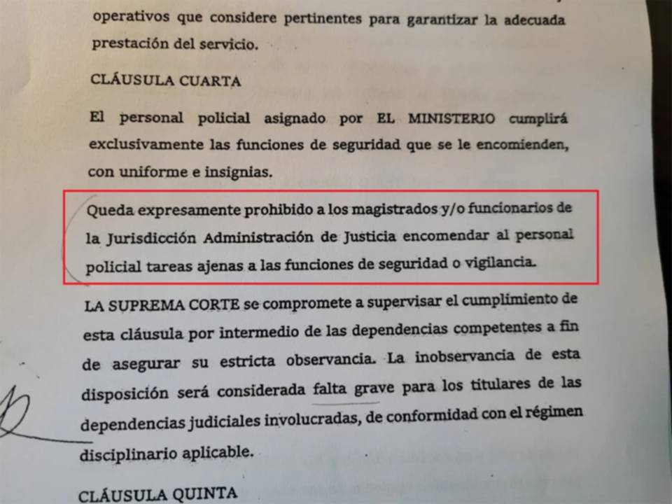 El acuerdo tiene como objetivo principal reforzar la custodia en sedes tribunalicias, aunque uno de sus puntos más destacados es la delimitación de funciones del personal policial. En su cláusula cuarta, el documento establece que los efectivos “cumplirán exclusivamente funciones de seguridad” y prohíbe de manera expresa que magistrados o funcionarios les asignen tareas ajenas a ese rol.