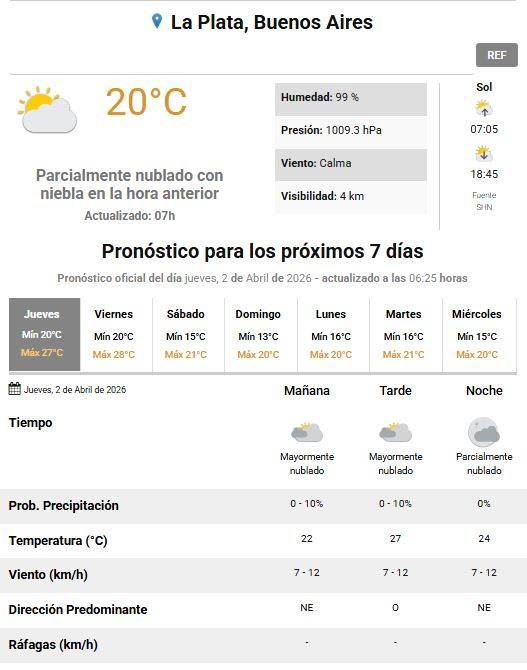 Para este jueves santo el Servicio Meteorológico Nacional (SMN) pronosticó cielo mayormente nublado a lo largo de la jornada, vientos leves y temperatura mínima de 20 grados y máxima de 27.
