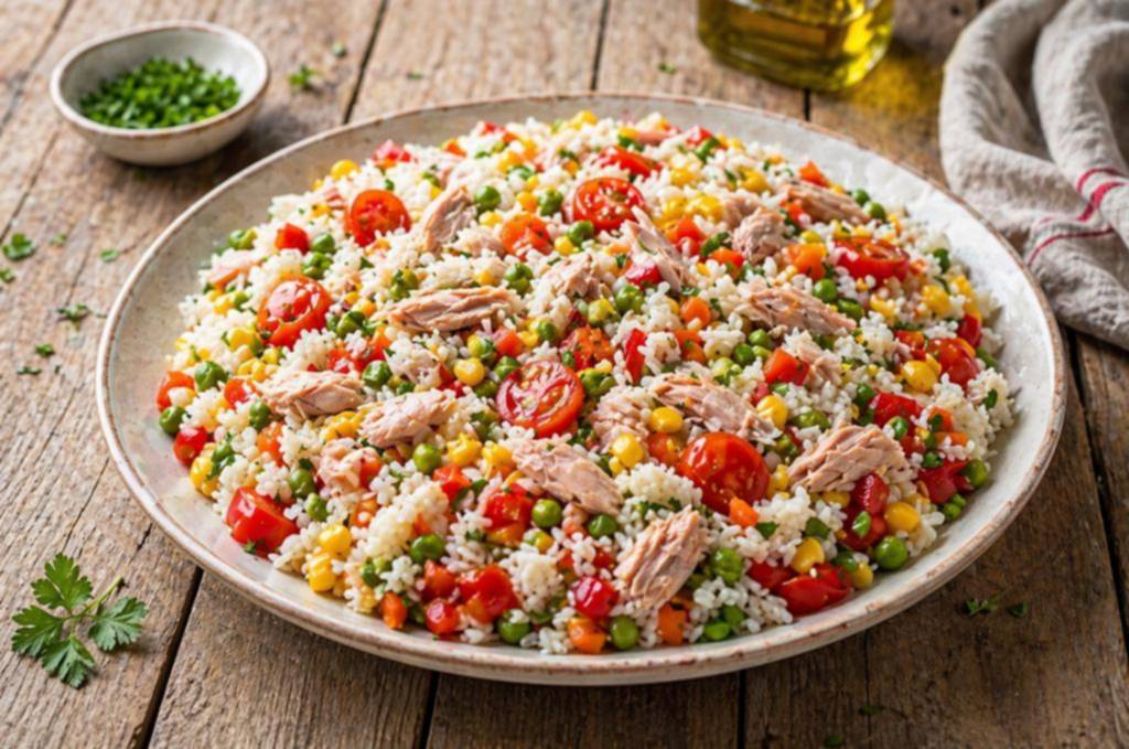 En su forma más clásica, esta ensalada se apoya en un arroz grano largo, cocido hasta quedar suelto, que actúa como base neutra. A partir de allí, el atún aporta profundidad y proteína, mientras que las verduras suman color, textura y frescura. El resultado es un plato equilibrado, liviano y al mismo tiempo satisfactorio.