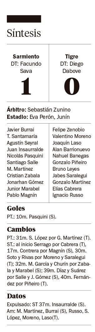Con gol de Nicolás Pasquini en el amanecer del juego, Sarmiento derrotó 1-0 a Tigre y se subió a la expectativa por clasificar a los octavos de final del Torneo Apertura. El conjunto dirigido por Facundo Sava fue un justo ganador y aguantó bien, a pesar de jugar los últimos minutos con un hombre menos por la expulsión de Juan Manuel Insaurralde.