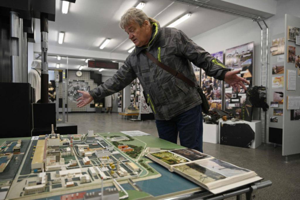 Nikolái gesticula junto a una maqueta de la central de Chernobyl, en el Museo de la ciudad de Slavutych / AFP