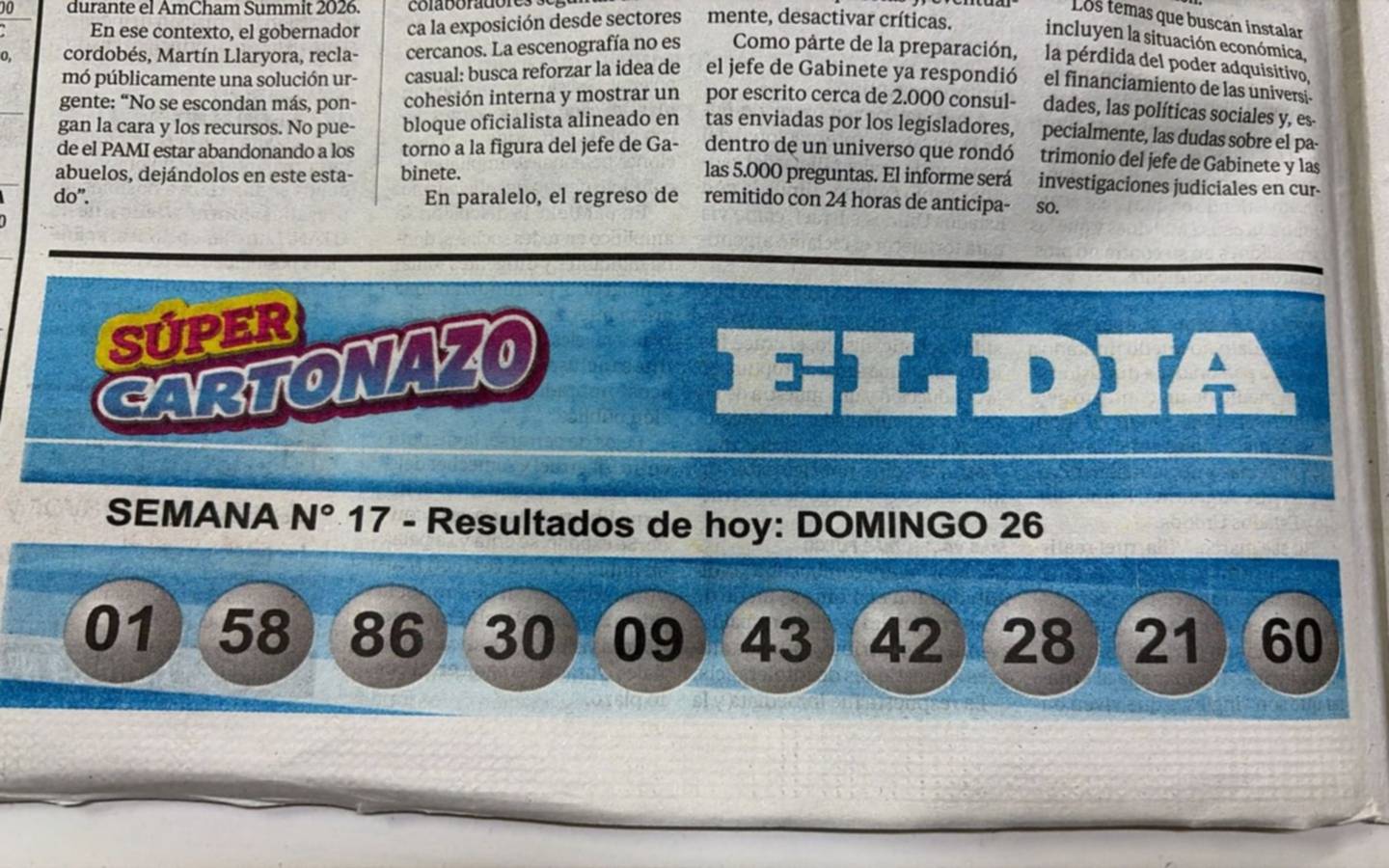 El Súper Cartonazo de EL DIA ya se juega por $2.000.000. El pasado jueves se entregó la nueva tarjeta gratis con la edición impresa del diario y también desde el pasado viernes se publicó la primera tanda de números para controlar y buscar ser el ganador.
