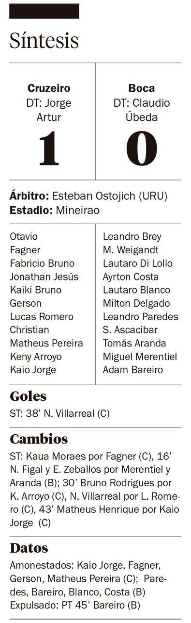 Qué bronca, Boca. En un partido caliente, friccionado y más disputado que jugado, Cruzeiro ganó 1-0 y se volvió a poner en carrera además de cortar la racha positiva del Xeneize en este tramo del semestre. Para explicar este triunfo no se puede pasar por alto la expulsión de Adam Bareiro en el final del primer tiempo que condicionó por completo las acciones del partido.